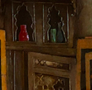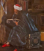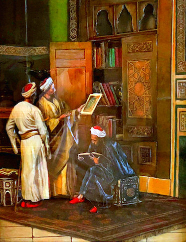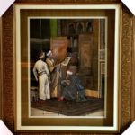 A reproduction from a original painting by Ludwig Deutsch. Printed on canvas made in a 3D embossed style using real materials. fabric, leather, wood, carpet materials, A single embossed antique gold frame, with a peach color mounting board. Glass protected frame. All hand painted using acrylic paints and finished with a protection spray coating.