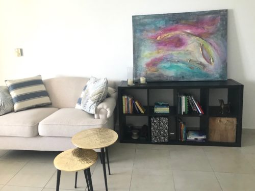 A sense of self is a playful expression with colours of turqoise, pinks & purples and gold. It’s all over the place, depth, intensity, playfulness- it tells a story of the natural flow that comes from just being you which is in contrast to limitations of daily life and the darkness that holds us back.