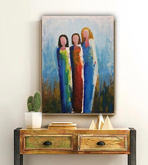 Curated by Hanan Nagi Sisters.. This beautiful original painting represents the strong bond between sisters, vibrant colors show how powerful this relationship is. Abstract - Mixed Media on Canvas (oil + Acrylic) Dimensions 80x60x 3 cm By artist Sarah Ginidy
