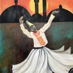This captivating oil painting depicts a whirling dervish lost in spiritual trance, set against a glowing sunset and mosque silhouettes. His flowing white robes twirl with grace, symbolising purity, surrender, and unity with the divine. The rich orange sky contrasts with deep teal shadows, creating a mystical, almost dreamlike atmosphere. The dancer’s serene expression and uplifted arms reflect devotion and inner peace, capturing the essence of Sufi spirituality. The composition blends movement, faith, and emotion into a powerful visual narrative of transcendence through sacred ritual and connection with the divine