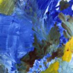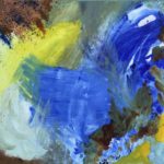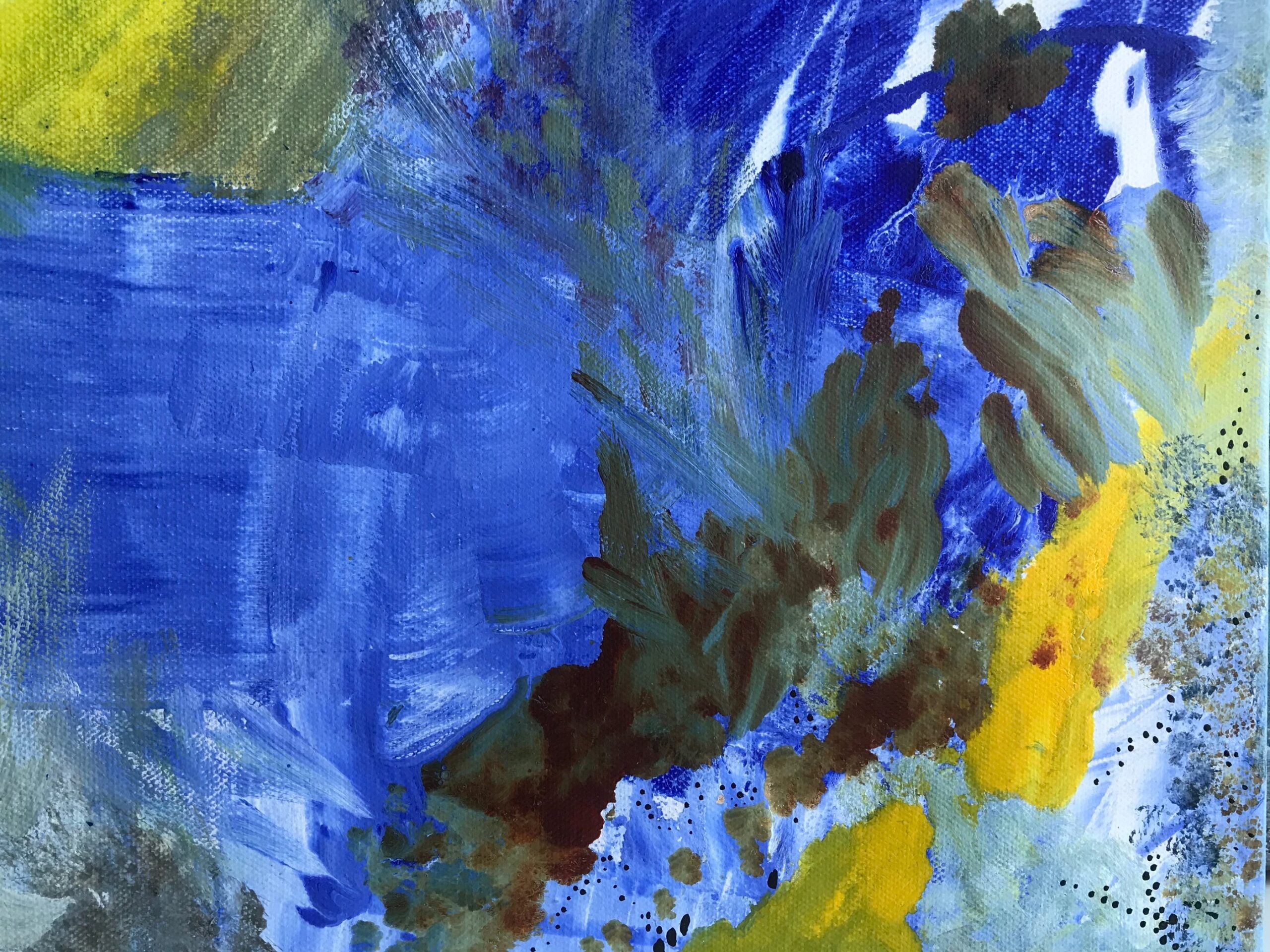 Yellow, blues and browns exploding into each other with a natural flow. Something that will make you happy to look at everyday. Has some bronze elements.