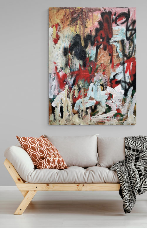 I made this painting in August 2019. The medium is acrylic and spray paint on canvas of size 35x47 in. I have signed it on the front. The stretched canvas is staple free sides, wired on the back and with no need for framing. It's ready to hang.