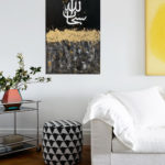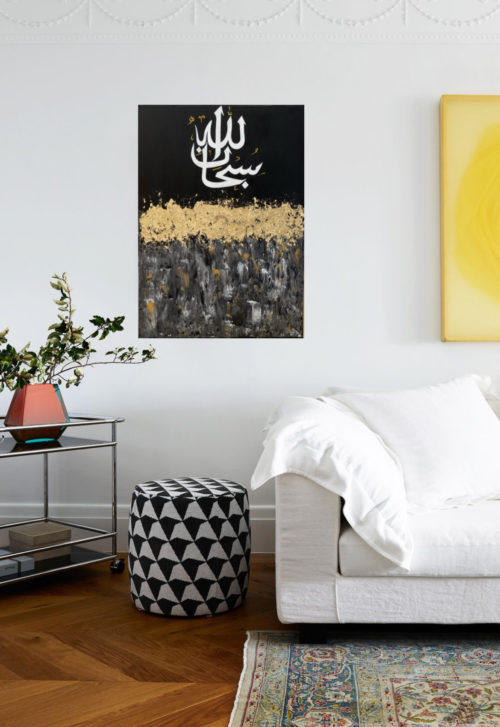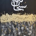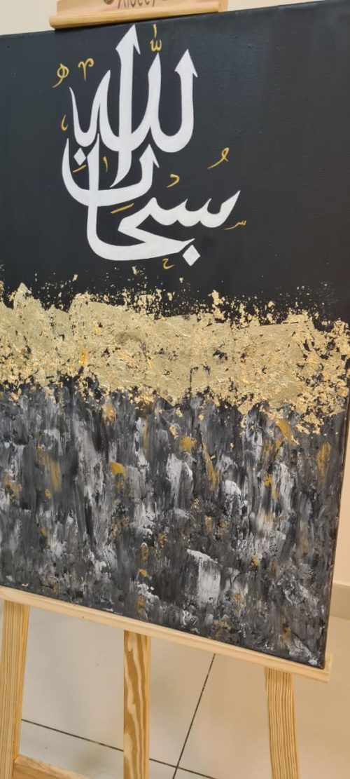 Hand painted Arabic Calligraphy in ‘Subhaan Allah’ with abstract background and a touch of good leaf
