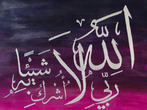 It is too easy to partner someone with Allah, it’s possible to slip into it in a very subtle manner but also very evidently. But as for a person with well grounded knowledge and seeks knowledge, adheres to his belief proclaiming the Oneness of the God. Material Description: Acrylic painting done on stretched Canvas and calligraphed with Thuluth Khat. Embellished using stones, beads and glitters. The whole painting has a glossy look and gloss varnished