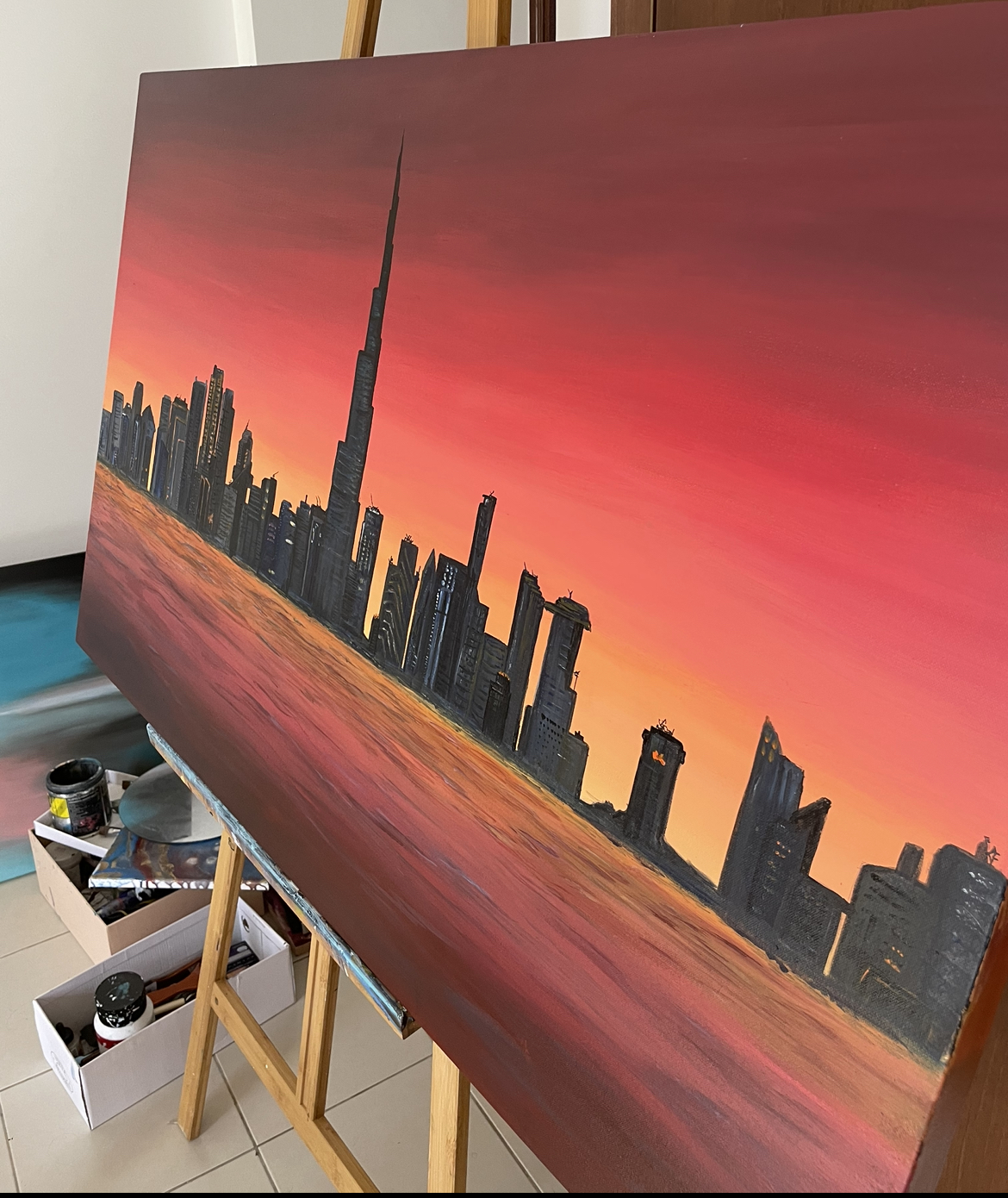 This painting is a show of brilliant sunset across the Dubai skyline as seen from the Dubai Creek Barbour. Beautiful sunset hues always encompasses the vastness of the universe. The colours were carefully blended in the painting to give the most detailed envision of a soothing and warm sunset scene.