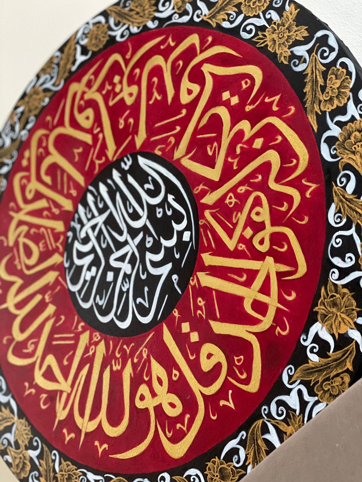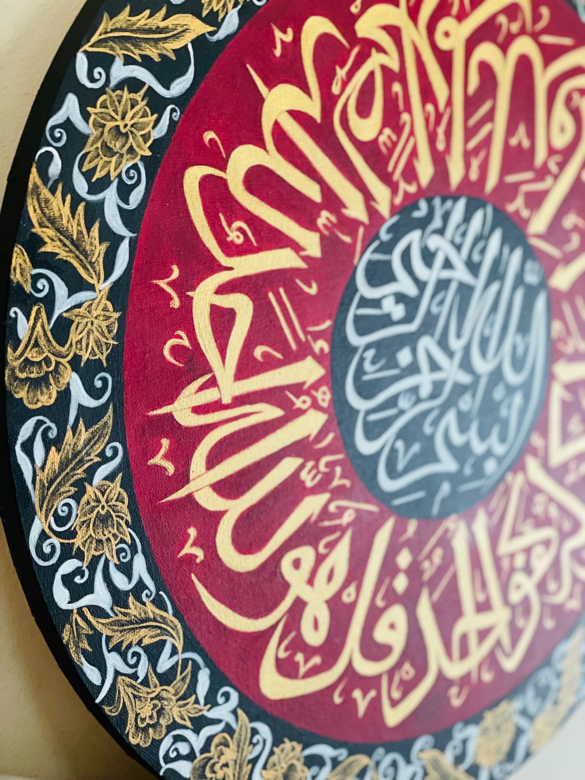 Handpainted Arabic Calligraphy of Surah Ikhlas on circular canvas with islamic illustrations