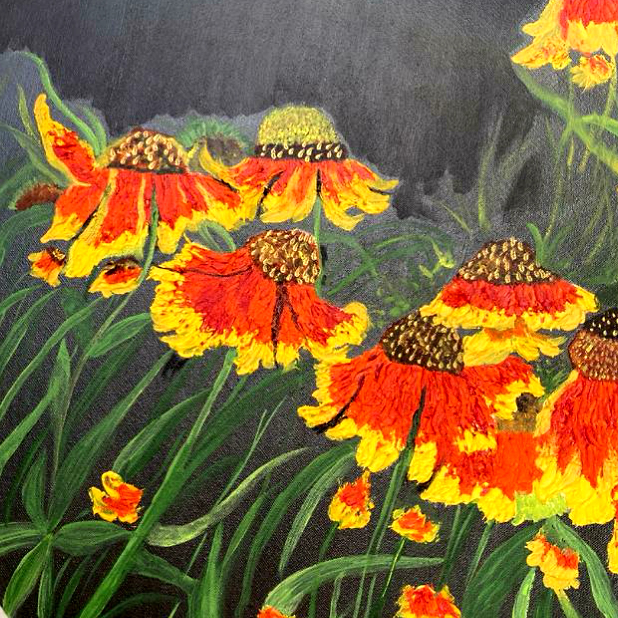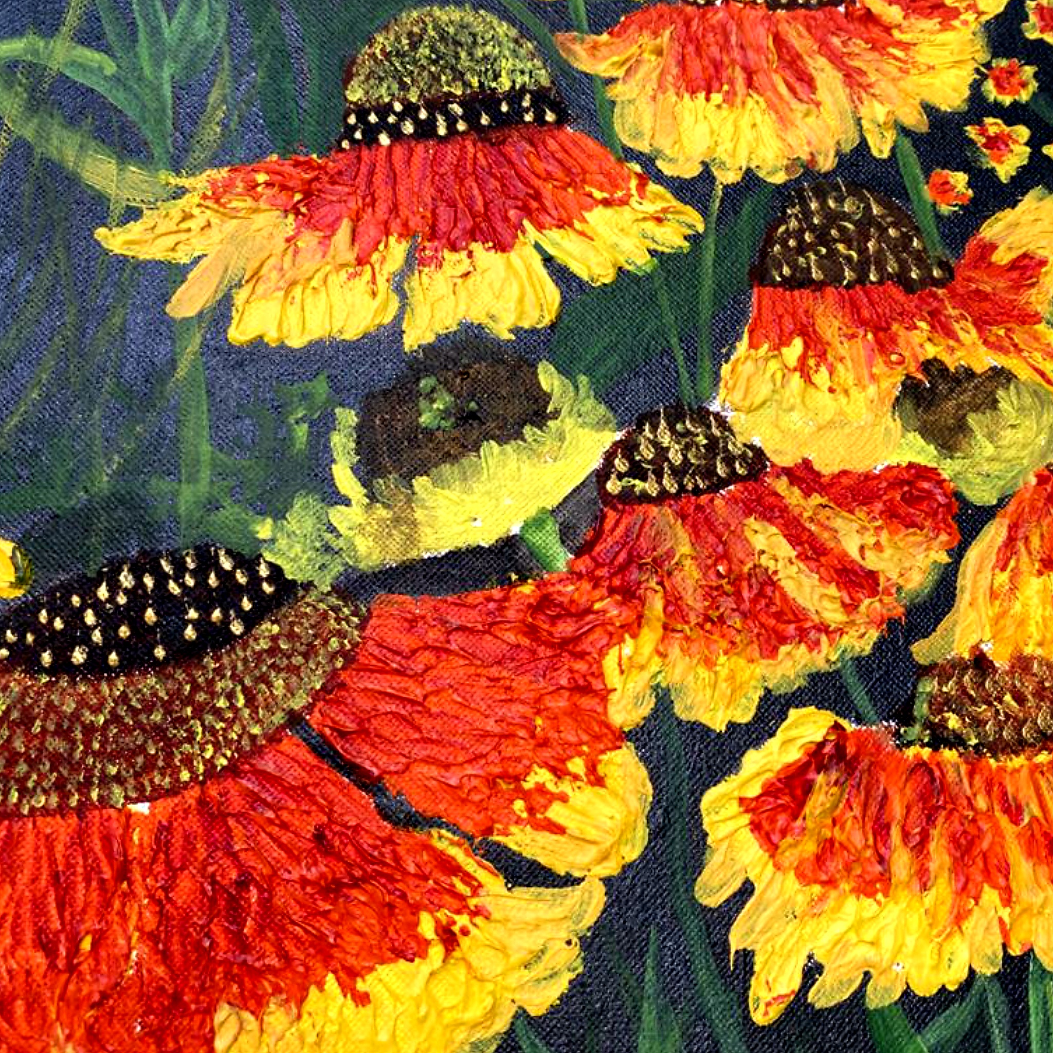 Blanket Flowers or Gallardia " as they are called are a species of flowers that are nourished by neglect . Being an avid gardener & a lover of flowers, these particular flowers from my Garden are far too colourful & have always caught my eye to paint them. Technique - Palette knife Painting.