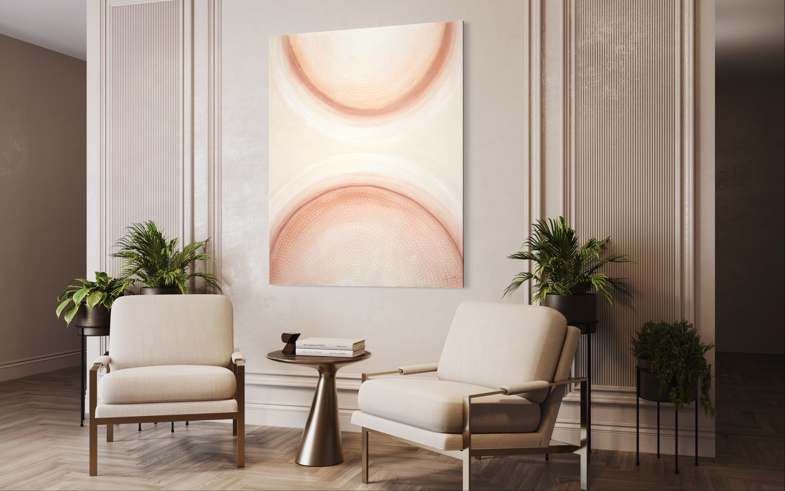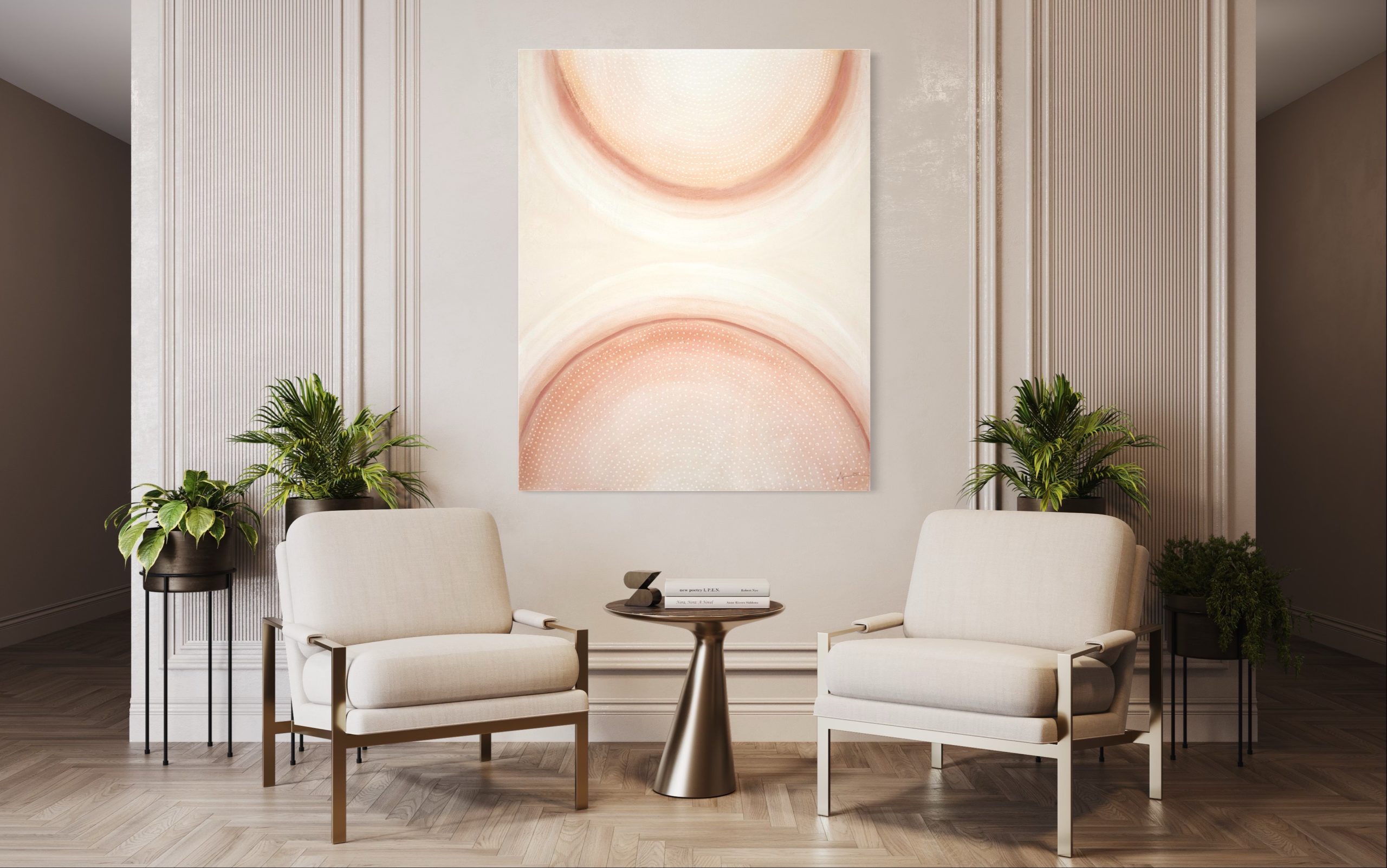 Terra Solis - Land of the Sun, is a celebration of the warmth and life that radiates from the sun. Made from acrylic and sand, the surface of the painting reminds us the desert that we call home. This collection explores the simplicity of minimalism and symmetry, letting the warmth of the colours and subtle changes in texture make a statement that doesn't need to be shouted.