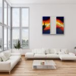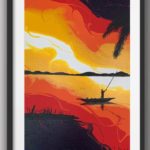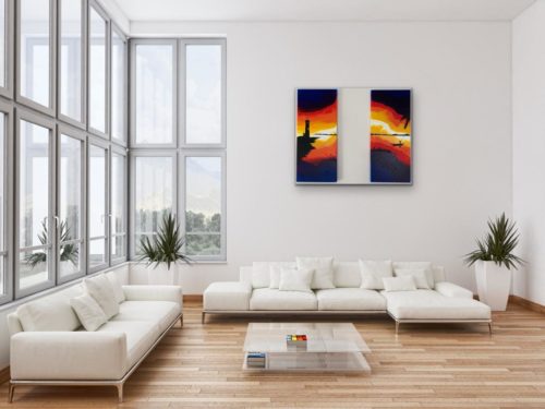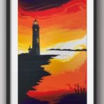 A set of two paintings done in acrylic with pour technique, some texture and brushwork, is a depiction of sunset sea view where a lighthouse adorns one piece and a returning fisherman on the other. Done in beautiful sunset colors, this piece can be a decor in any room.