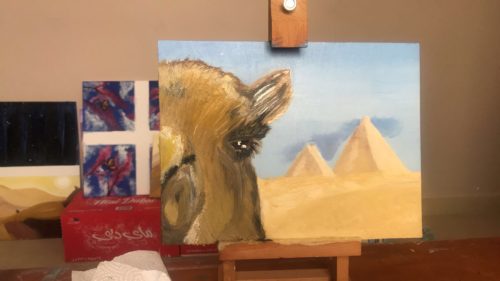 An oil painting of a camel in Egypt very textured with a-lot of details . Its on a small wooden canvas .