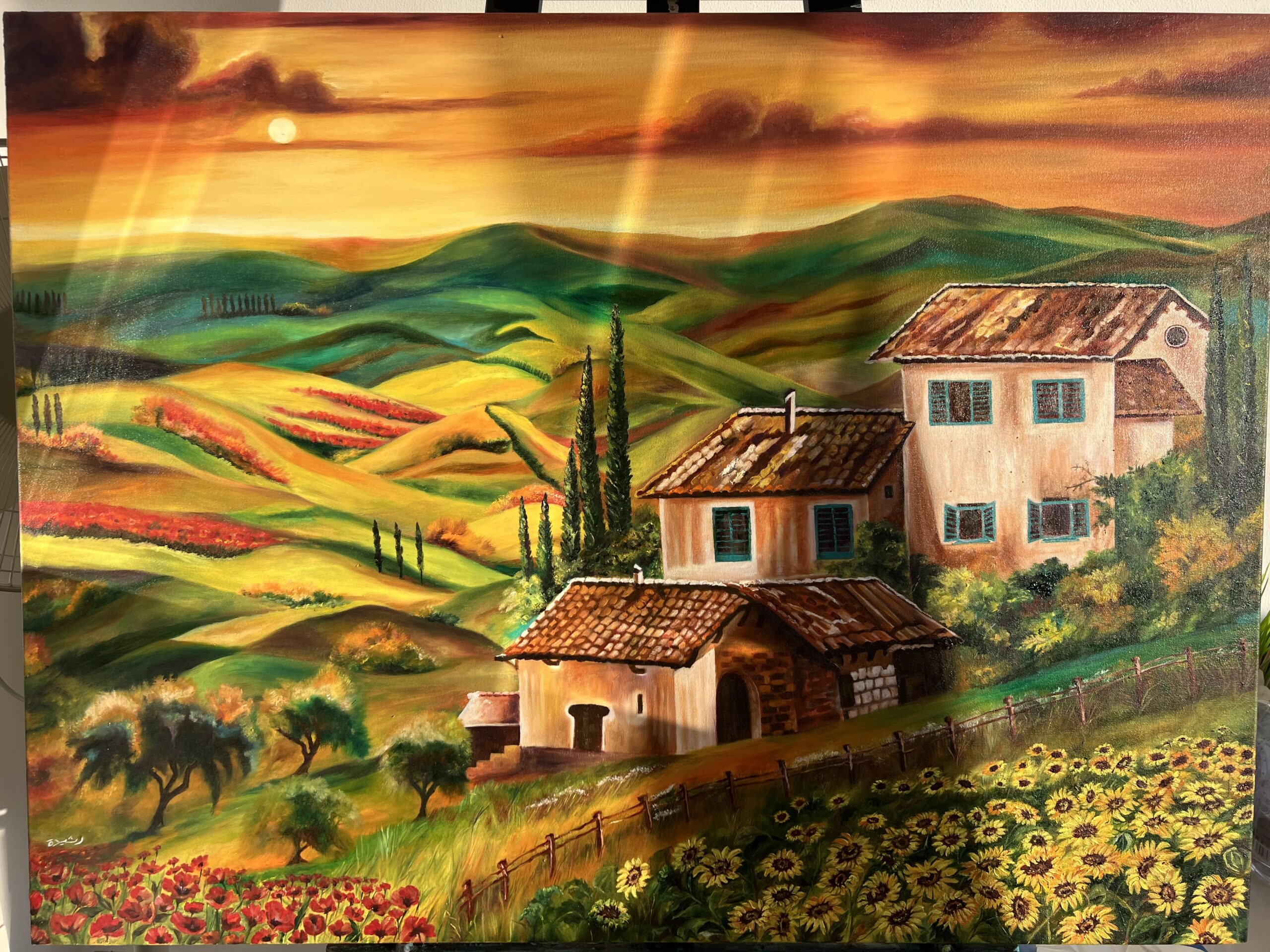 “ The Golden Tuscany “ Oil on canvas Tuscany will be my beloved destination for many reasons. Its stunning landscapes and the beauty of natural scenery fall short of words. The rolling hills, colourful sunsets, vast landscapes of vineyards, olive groves, and bike paths are breathtaking. It’s undeniably beautiful and perfect for photographing. The region is famous for its picturesque rolling hills, vineyards, and olive groves, offering breathtaking views and a serene atmosphere. Every scene is worth capturing. The remote houses on the hill top, the green meadows, drums of hay stacks, the lush green pastures, the long Cypress tress, each describes the typical beauty of Tuscany. Here’s my take on the scenic view of Tuscany, Italy.