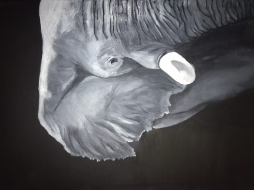 The memories of time walk her steps towards a safe, caring, meaningful and hopeful future. She is the living soul to her kin. This oil on canvas cries to be heard and seen as majestic as she comes in real life. I’m the “Matriarch” and I will lead!