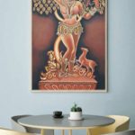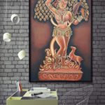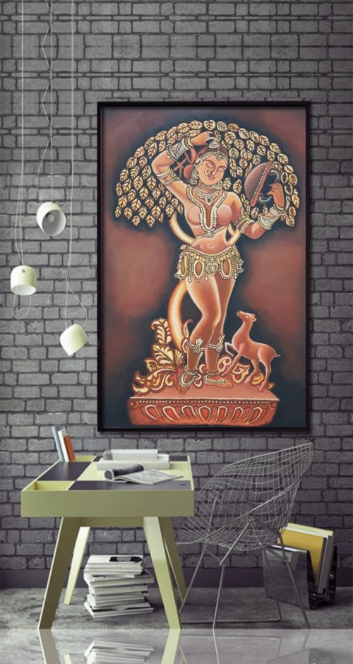 "The mirror beauty" This painting is inspired from one of the most beautiful sculpture from an Indian temple architecture. This magnificent sculpture is carved out of soapstone and is from Chennakesava temple in Belur, Karnataka. The sculpture depicts a beautiful woman, aesthetically decked up in jewellery from head to toe and admiring her beauty in a mirror delicately held in her hand by the metal clamp. The Darpan Sundari features the ‘Ajanta’ hairdo (YES! There were proper names for each of the 648 hairstyles depicted in this temple itself), where the circumference of the hair is larger than the face, thereby giving an appearance of a halo.This statue carved entirely out of stone is known for the aesthetic understanding of human body.