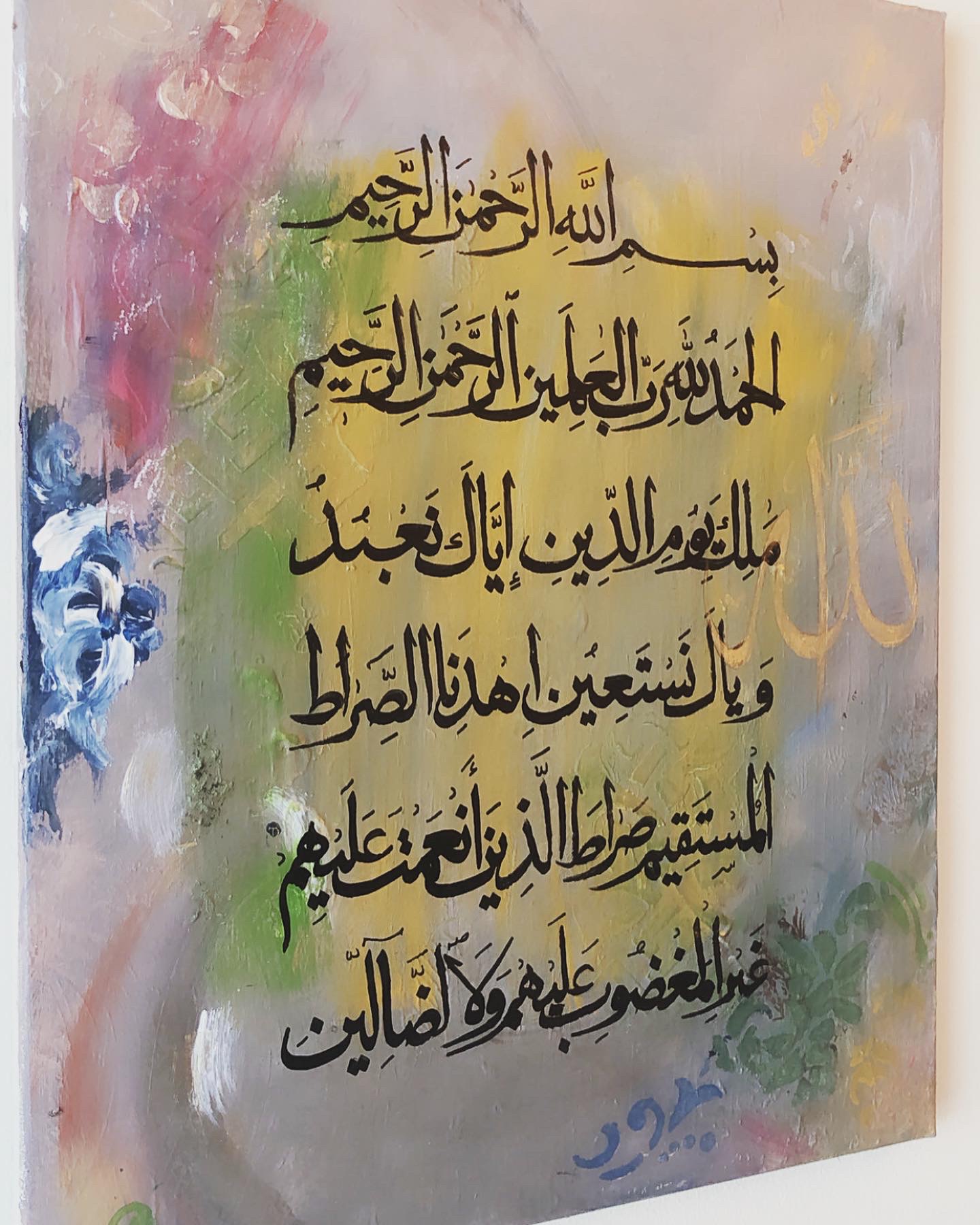 Beautiful abstract painting with textured background and splash if lively colours. Calligraphy verses of Surah Al Hamd.