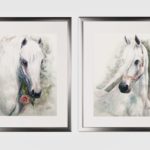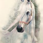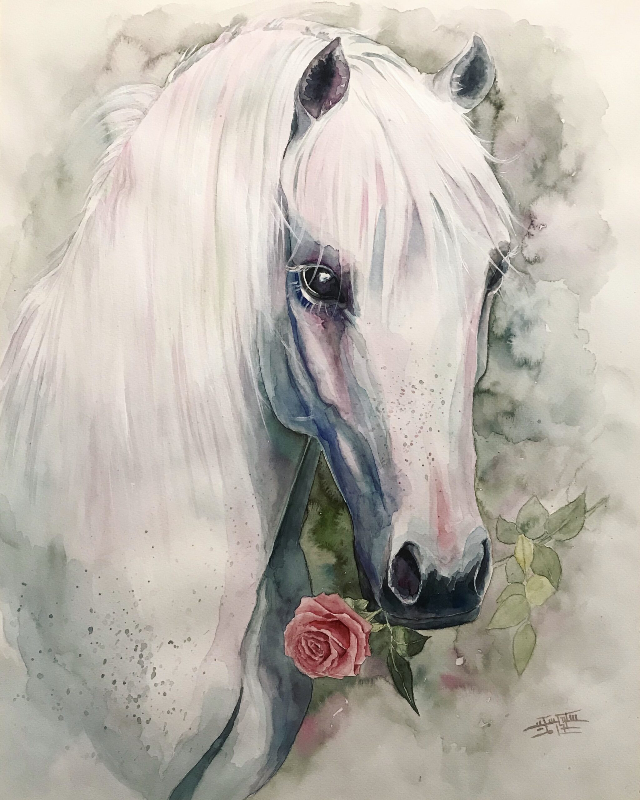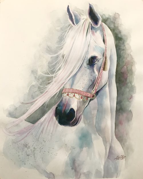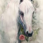 I am falling in love with White Horses. I used blue and purple colors to form shadows. Red and pink in the rose and the bridle to express love and my endless beautiful feelings to them. They are original, spirited, remarkably handsome and graceful animals. White horses have unpigmented skin and white hair coat. Many white horses have dark eyes, though some have blue or hazel eyes. These white horses especially those that carry one of the dominant white genes are rare. Truly white horses are born with white hair and mostly pink. I named those amazing creatures “The white souls”.