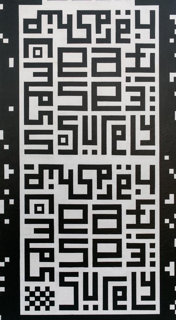 AL QURAN CHAPTER 94 SURAH ASH-SHARH VERSES 5 AND 6 meanings فَإِنَّ مَعَ ٱلْعُسْرِ يُسْرًا ٥ إِنَّ مَعَ ٱلْعُسْرِ يُسْرًۭا ٦ So, surely with hardship comes ease. Surely with hardship comes ease. This piece is inspired by the extracts of the very old and prominent Kufic scripts which date back to the seventh centuries. I've given it a completely new dimension by replacing Arabic with English letters.