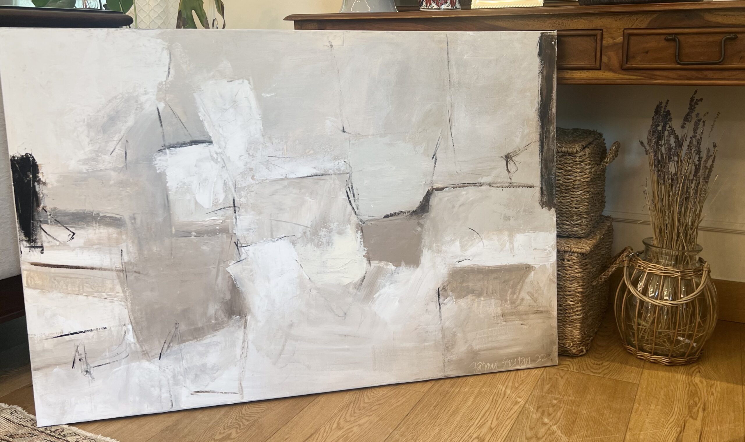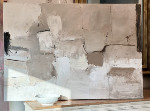 A very modern abstract with beautiful light color palette. Minimal with sleek straight lines and simple patterns, lightly textured adding that sereneness to it.