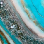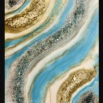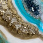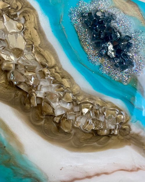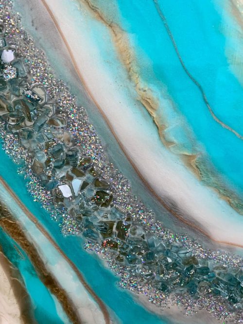 “Treasure Islands” navigating the transparent turquois Water through islands of Gold & Silver. • Art Style: Contemporary, Abstract & Mixed media • Art Medium: Resin Art, Geode on wooden decorated with broken glass & glitter