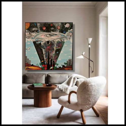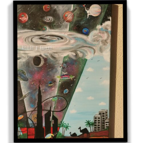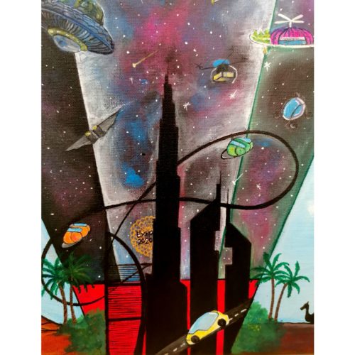 UAE - Sky is not the limit! This Painting depicts how UAE has turned the tables from a beautiful desert to a one progressive country where people from around the world despite their differences has gathered as one powerful nation and working day and night for its progress . In next fifty year UAE will be more technically advanced and a sustainable country and reach other planets too. Celebrating 50 years of successful legacy and the future of transformation