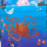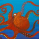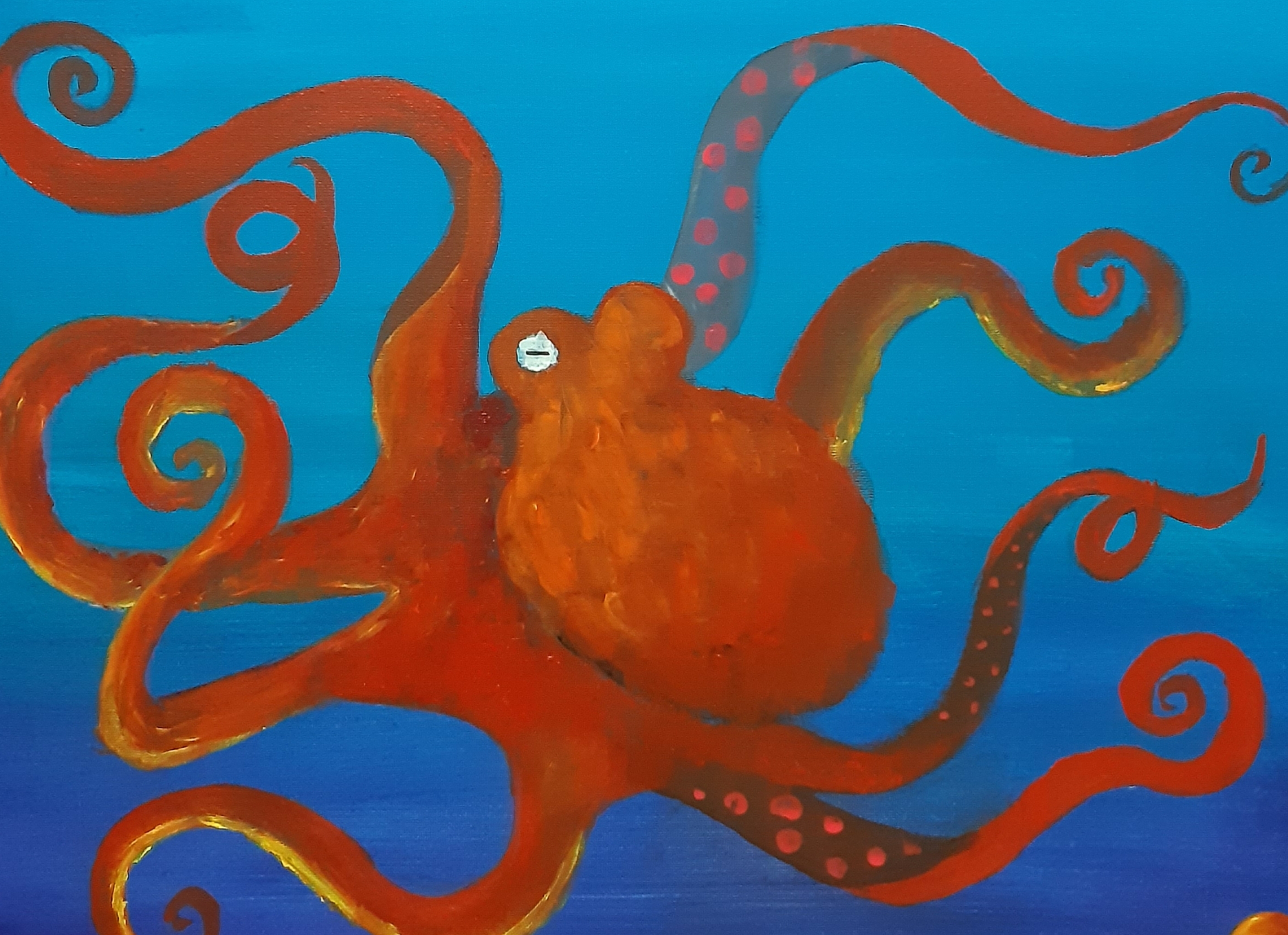 The octopus is the star of the painting. Some other kinds of sea creatures painted around the octupus.