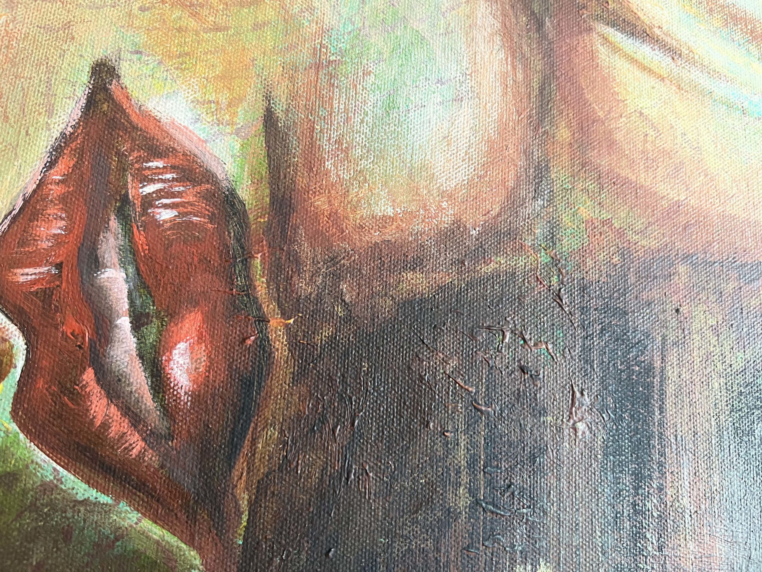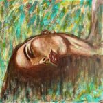 The literal meaning of ‘Untethered’ is not physically tied, connected or fastened to something. The painting draws upon that with the analogy of human life and the free soul. It is an interpretation of the artist where the subject lies bare bodied on a fresh bed of grass in a vast meadow with the company of no one but the silent inner voice. Free of all connections with the outer world, the noise, the chatter- the ‘Self’ is floating free through the river of life. One is at peace, joyful, calm and ready to navigate all the challenges of life if we look at it internally. Make connections with yourself, live in the moment, identify more with the spirit than form and exist without striving, without explanation. Be ‘Untethered’- Freedom from having a closed mind, stay open, receive, stay conscious and you will receive permanent joy and happiness.