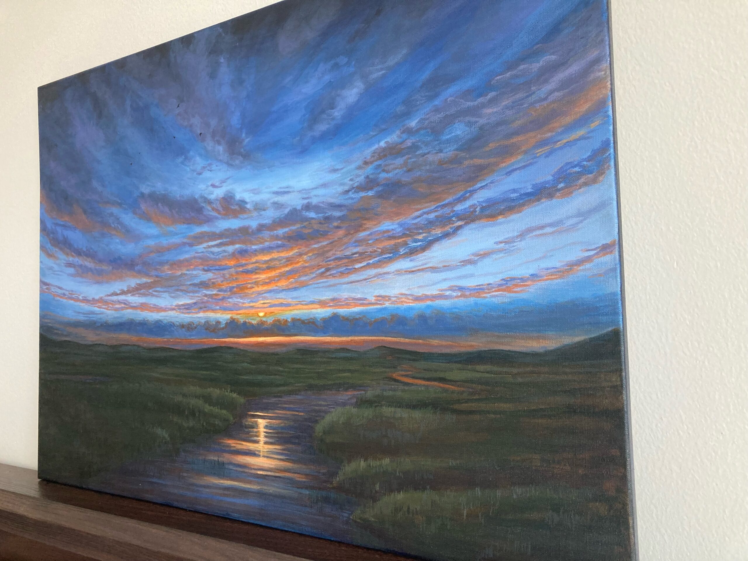 This is a beautiful Acrylic painting which captures sunset over the wetlands . I wanted to capture the feeling of bliss and peace as you view nature at its best.