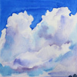 Fluffy white clouds in the summer afternoon with deep blue sky surprise the eyes. Technic and expertise in handling watercolour medium are excellent.